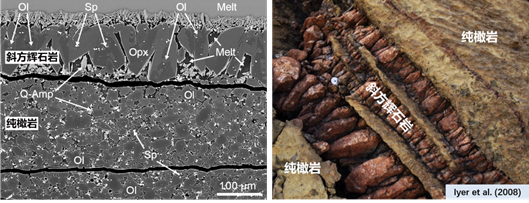 1. 含水熔体-橄榄岩反应实验结果(左)与蛇绿岩(右)中的斜方辉石岩-纯橄榄序列