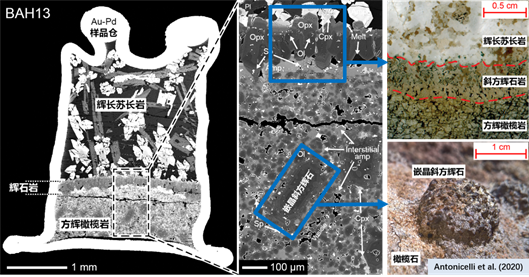 3. 含水熔体-橄榄岩反应结晶实验结果(左)与壳幔边界(右)的苏长辉长岩-斜方辉石岩-角闪橄榄岩序列