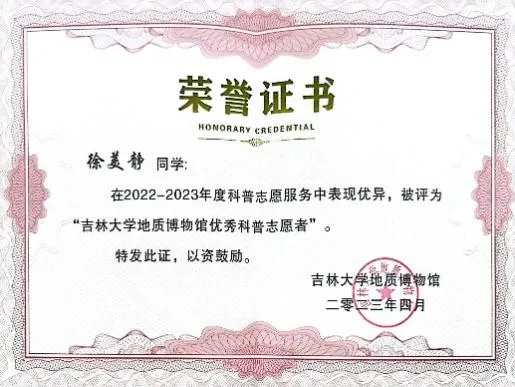 地质博物馆三个微信官方公众号的负责人,在职期间,发布推送1600余条。连年获评校优秀学生干部、校优秀团干部、校优秀朋辈心理辅导员等多项荣誉。