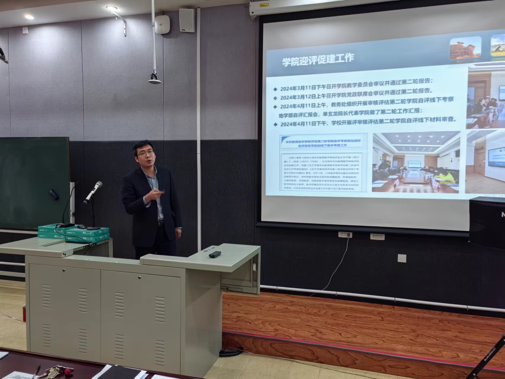 工作再上新台阶。副院长许中杰就本科教育教学审核评估自评情况进行了汇报,副院长柳蓉就地质学学位点2020-2025年学位授权点周期性合格评估情况进行了汇报。
