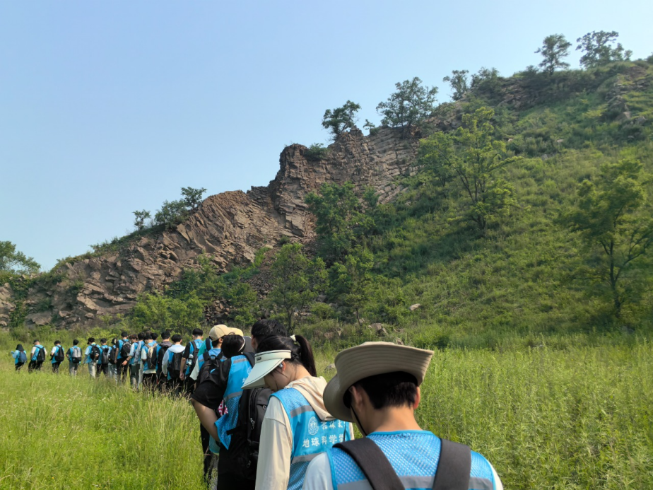 2023级暑期长春周边认识实习队踏上新的征程,带队教师与2023级全体本科生乘坐大巴车,出发前往西尖山。实习期间,同学们在老师的专业引领下,全面考察了西尖山的各个地质特征点,观察学习玄武岩的柱状节理构造、火山锥的成因机制、岩石的结构特性以及地质构造的演变脉络。同学们认真聆听讲解,细致记录,并积极提出自己的疑问和观点,现场学习氛围浓厚且活跃。