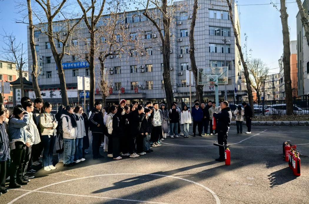 讲座结束后,在场师生在保卫处老师的指令下进行消防演练活动,同学们在楼层疏散引导员的指挥下,低伏姿势捂住口鼻,有序地向鸽子楼外撤离。在室外,老师向同学们讲解了干粉灭火器和二氧化碳灭火器的使用方法,指导同学们正确使用灭火器扑灭明火。