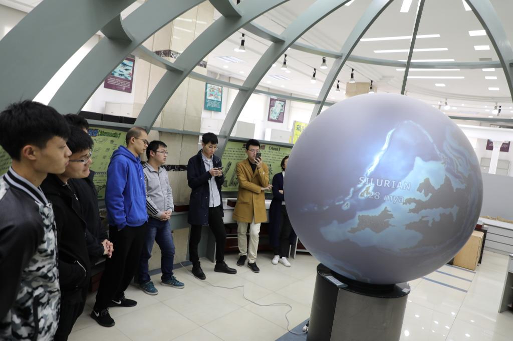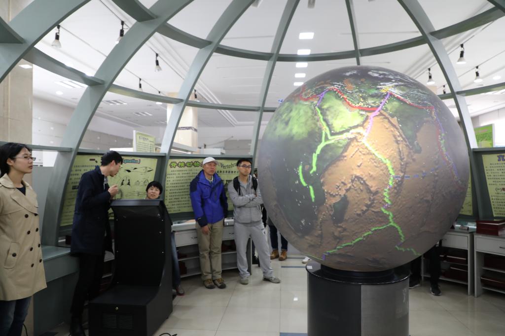上午9点,同学们前往地球演化综合实验室。在霍亮老师的带领下,同学们通过观察岩石和古生物标本,结合自己的所学知识,一步一步恢复着前寒武纪到第四纪距今五亿年的地球演化进程。在此过程中,霍亮老师借助数字地球设备,为同学们展示了大陆板块的漂移、各个地质时期地球演化、火山活动与地震带、地震、海啸等灾难模拟、行星地质等典型的现象,帮助同学们进一步直观地感受地质演化。在孟庆涛教授的带领下,同学们参观了吉林省油页岩与共生能源矿产重点实验室,了解17吃瓜网