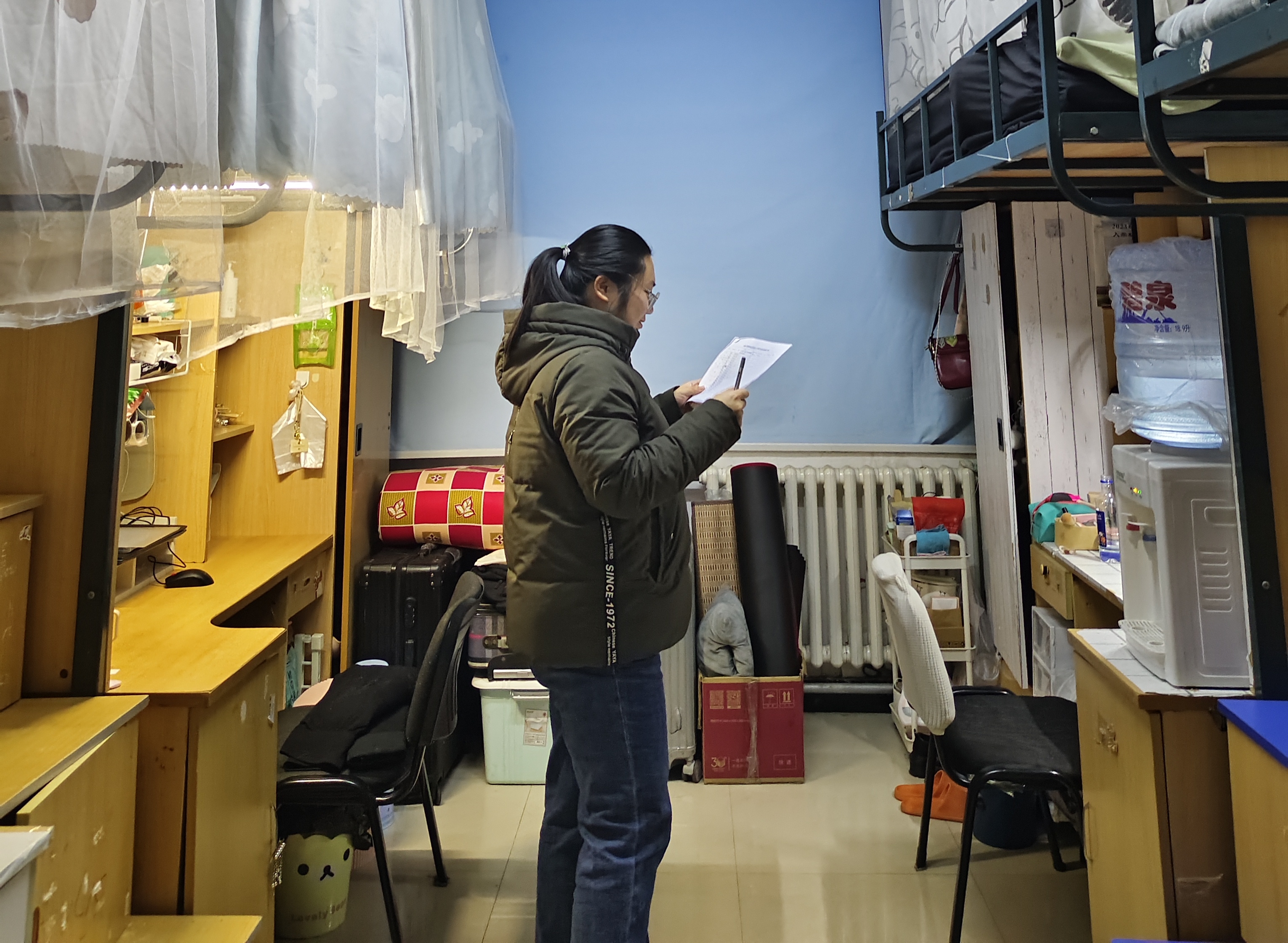 所有研究生寝室进行了拉网式、全覆盖的自查工作。检查内容不仅涉及寝室内务卫生,更将安全隐患排查作为重中之重,确保研究生人身和财产安全。工作小组着重检查了寝室内是否存在大功率电器、易燃易爆物品及管制器具等安全隐患,将寝室安全情况作为衡量寝室管理质量第一标尺,严把寝室安全大关。在确保寝室安全达标基础上,工作小组严格按照《标准》逐项打分,对寝室内的学习用品、生活用品摆放,床上用品叠放,床下及书桌下物品整理,以及被褥、衣物等是否有异味等进行了细致检查。此外,工作小组还借此契机,积极了解研究生的思想状况,关注研究生在日常学习生活中遇到的重难问题,倾听需求,及时解决,着力做好研究生生活保障工作。