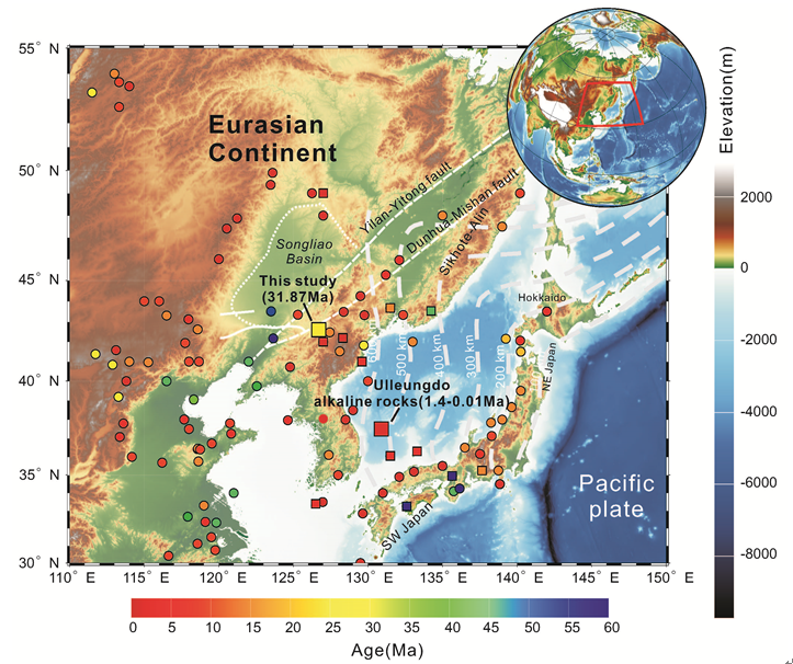 图1 东北亚陆缘新生代碱性火成岩分布图。圆形代表基性碱性岩,方形代表中性碱性岩,颜色代表年龄。数据来自GEOROC数据库(//georoc.mpch-mainz. gwdg.de/georoc/)