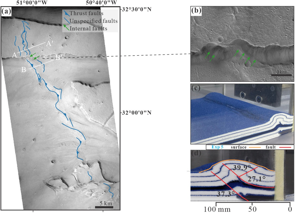 在火星皱脊形成机制研究中,课题组通过沙箱物理模拟实验,揭示了地下滑脱层(软弱层)的黏度、厚度及分布对皱脊形成的控制作用。研究结果表明,脆性滑脱层导致对称型皱脊,低黏度韧性滑脱层形成前陡后缓的单拱构造,而高黏度韧性滑脱层容易产生次生断层。特别是双滑脱层与盲断层组合实验,成功再现了火星广泛存在的“宽拱+窄脊”皱脊特征。通过对比火星典型区域高分辨率遥感数据,研究团队进一步证实了实验模拟的可靠性,首次提出了以皱脊地貌反推地下水冰或挥发物分布的新思路,为未来火星水冰资源勘查及探测任务着陆区选址提供了重要科学支持。