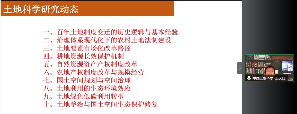 学的研究动态,包括百年土地制度变迁的历史逻辑及基本经验、治理体系现代化下的农村土地法制建设、土地要素市场化改革路径、耕地资源长效保护机制、自然资源资产产权制度改革、农地产权制度改革与规模经营、国土空间规划与空间治理、土地利用的生态环境效应、土地绿色低碳利用转型、土地整治与国土空间生态保护修复等十项内容;王老师指出,当前土17吃瓜网
