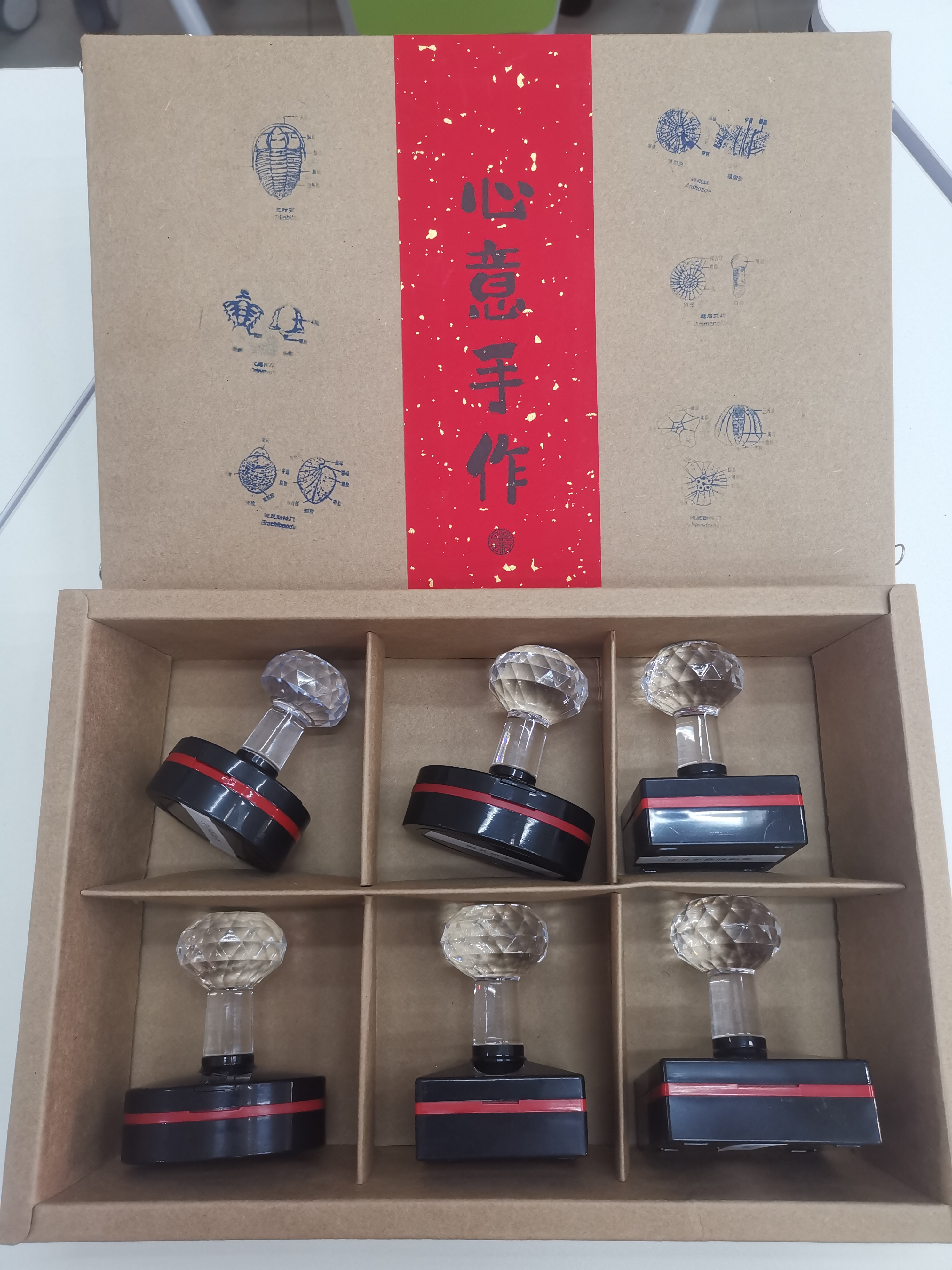 印章为“万物醒-古生物文化领域先行者”创业训练项目(国家级202310183002X)成果。取材于二年级古生物学课程实验报告中的化石素描,经扫描加工而成,包含莱德利基虫、叉尾虫、菊石、珊瑚薄片、鸮头贝、海蕾化石6枚印章。化石印章是传统文化与自然学科的跨界融合,将史前生命的轮廓镌刻于方寸之间,追溯亿年前的地球故事;取材于课程实验学生素描作品,作为学习奖励,送每位莘莘学子一朵小红花。