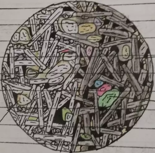 在《岩石学》的实习课中,老师要求同学们进行镜下薄片素描。不要以为素描是个简单的事情。薄片的素描要求同学们按比例将显微镜下岩石的矿物组成、形态、含量及显微结构特征等表现出来。打个比方,这就像是要求我们在做高数大题的同时仔细分析出全部考点并逐一解决一样。