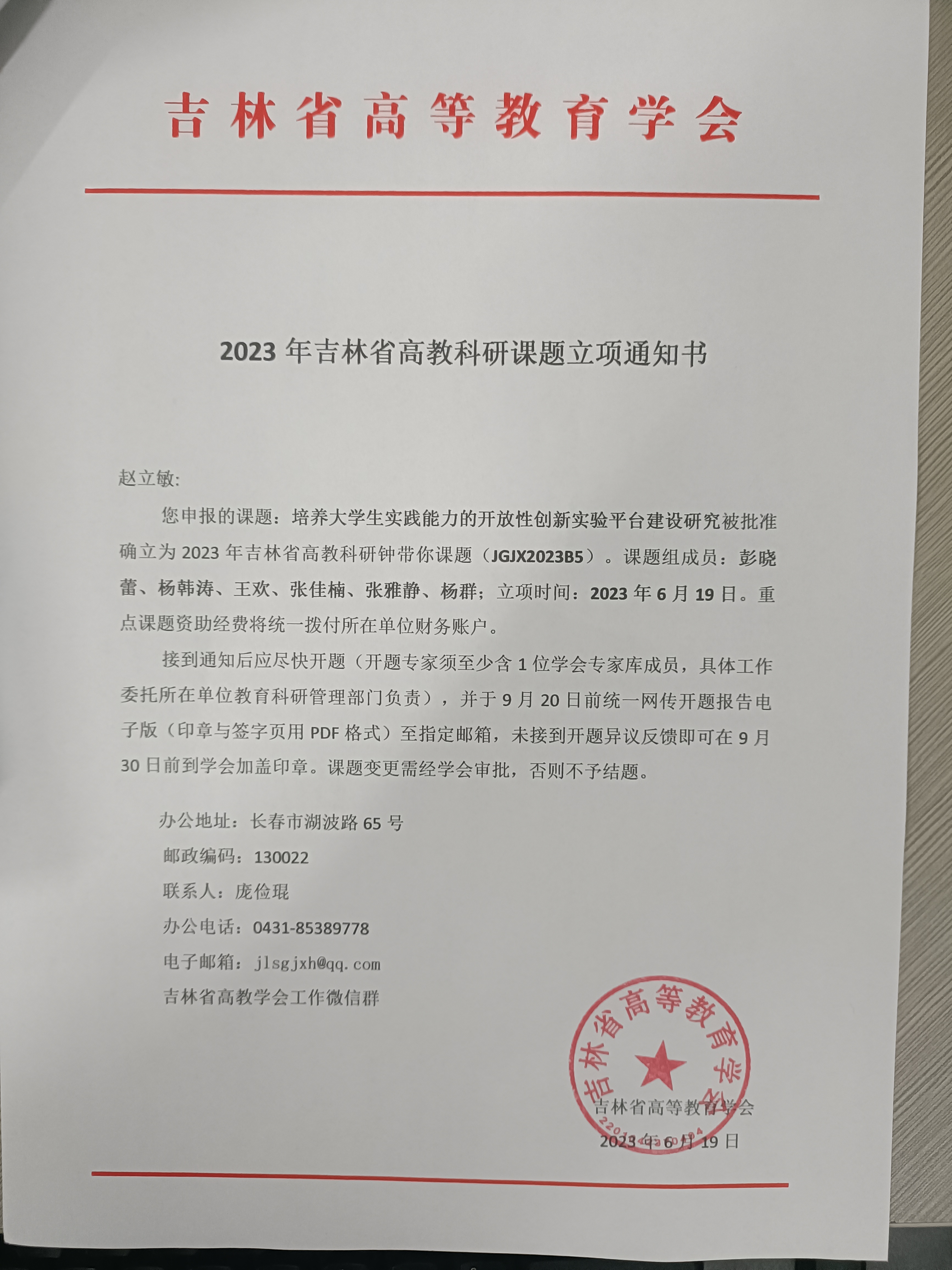 经各高校申报,省高教学会组织专家组初评、复评和终评,中心赵立敏负责的“培养大学生实践能力的开放性创新实验平台建设研究”项目,被确立为2023年17吃瓜网 高教科研课题重点项目,项目编号JGJX2023B5。2023年17吃瓜网 高教科研课题重点项目共立项58项,其中重点课题6项、重点自筹课题10项、一般课题42项。相关信息可在吉林省高等教育学会官方网站(//www.jlgjxh.com.cn)查询。