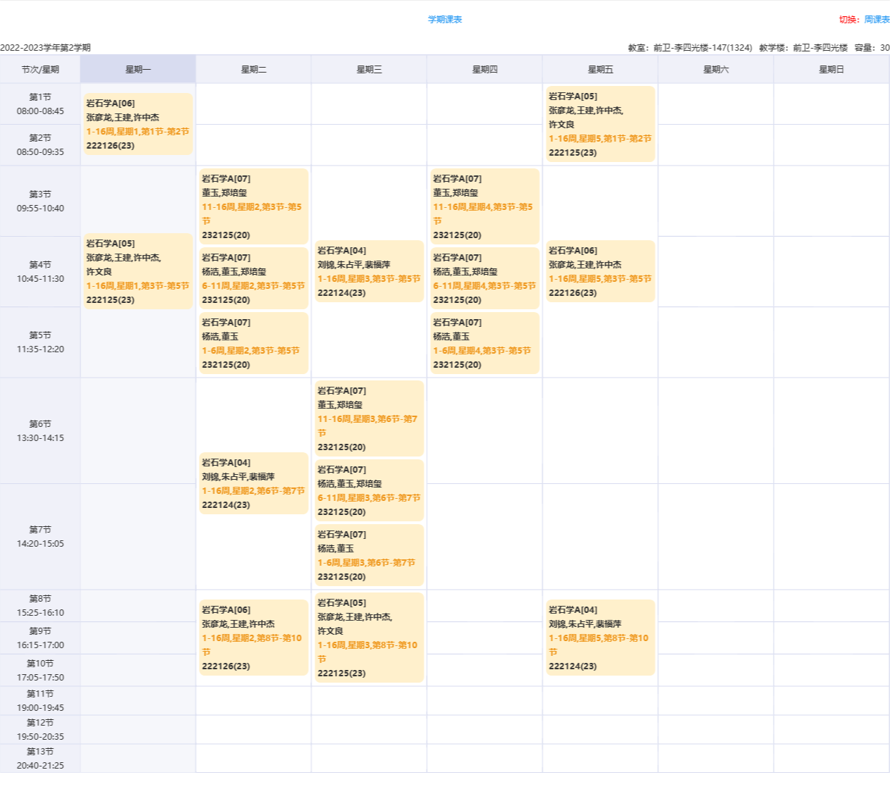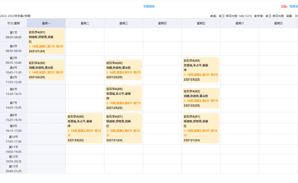 2022-2023学年第二学期(2023春季)课表