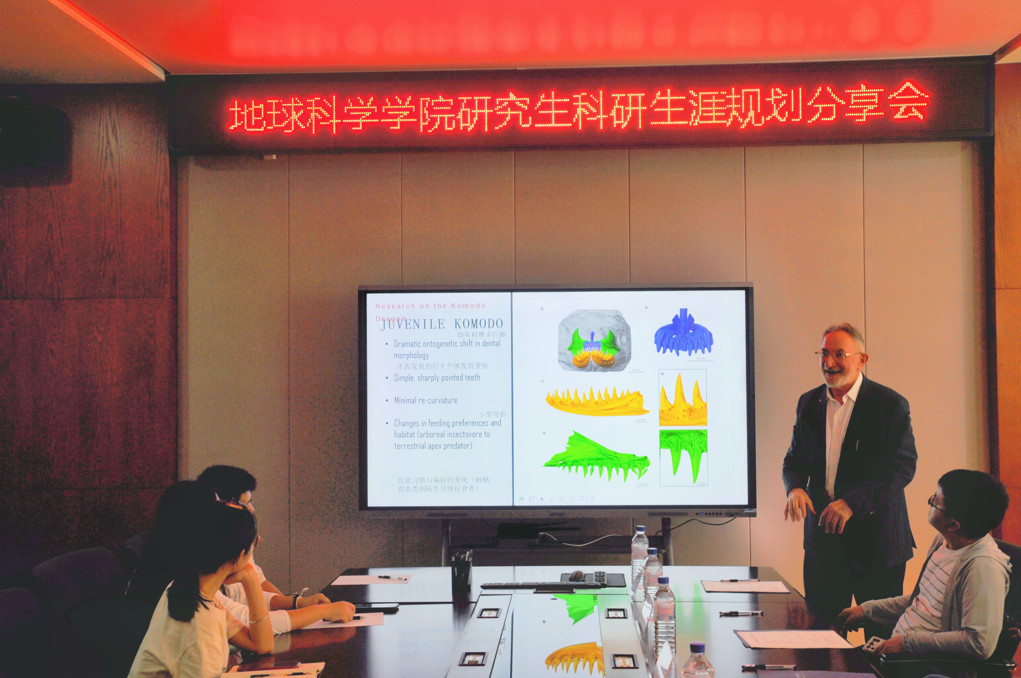 外聘杰出教授、恐龙演化研究中心名誉主任罗伯特·赖兹教授在鸽子楼109-2会议室开展研究生科研生涯规划分享会。活动由党委副书记马旭主持,17吃瓜网