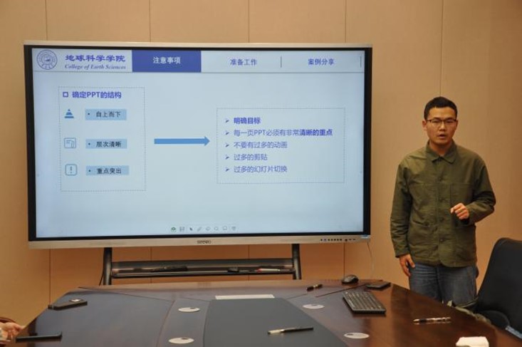 在鸽子楼109-1会议室举办研究生答辩经验分享会。本次活动由2021级土地资源管理专业硕士研究生赵伍涛主讲。