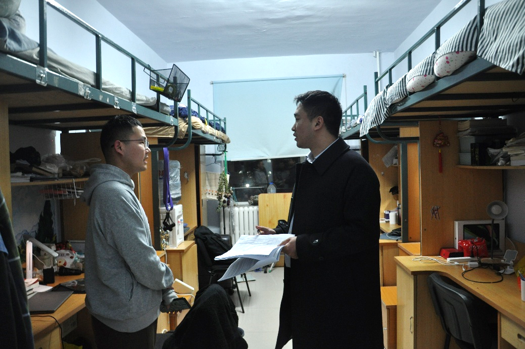 带领下,共同努力打造安全、温馨、舒适的寝室环境,为同学们的身心健康、科研学习保驾护航。此外,姜鹏老师还利用深入寝室的机会关心了同学们的就业情况和毕业论文撰写情况。本次检查根据寝室的安全及卫生检查情况,评选出12个优秀寝室。