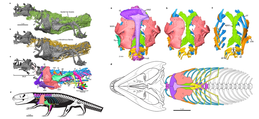 图1. 木乃伊化的大鼻龙(Captorhinus)遗骸标本及胸廓部分的三维重建