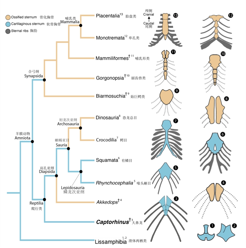 图3. 四足动物主要类群的胸骨及胸肋的结构示意图