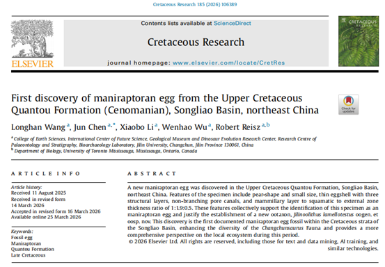 以上研究成果于2026年4月3日正式以“First discovery of maniraptoran egg from the Upper Cretaceous Quantou Formation (Cenomanian), Songliao Basin, northeast China”为题发表在国际知名学术刊物《Cretaceous Research》上。17吃瓜网