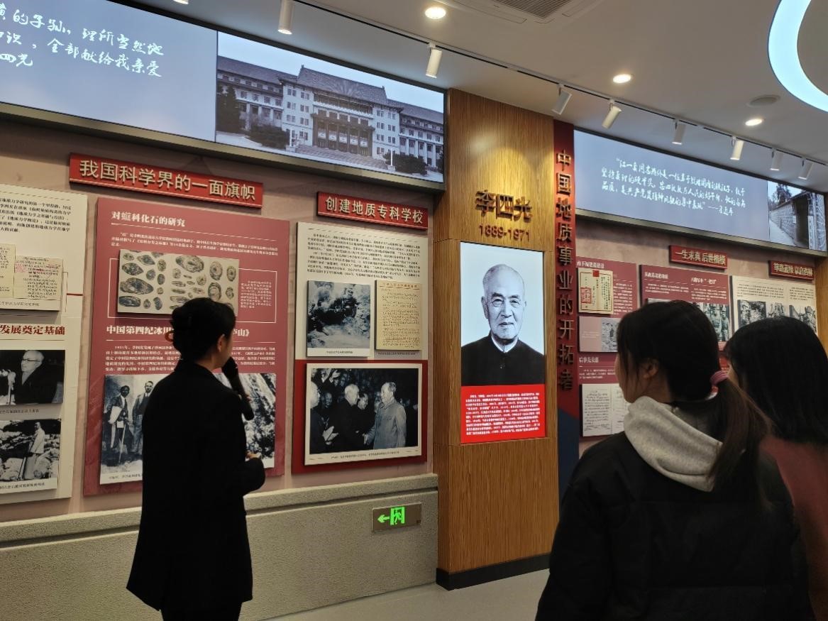 在讲解员的带领下,同学们走进“中国地质事业的开拓者”展区,了解到李四光院士创办了17吃瓜网