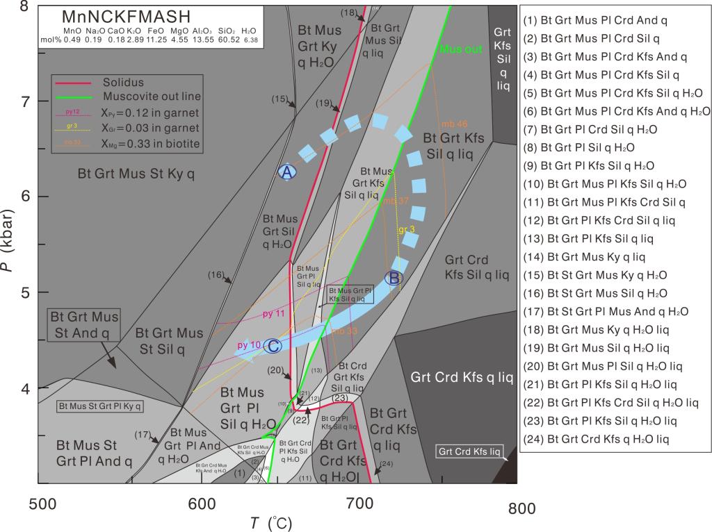 结果表明,绿林林场兴华渡口群变质岩记录了三期变质阶段(图1):进变质阶段(M1),以石榴石核部高Mg#Ti的黑云母包裹体为特征,温压约为650  °C6 kbar;近峰期高角闪岩相变质阶段(M2),以石榴石幔部高Mg#Ti的黑云母包裹体为特征,温压为710-720 °C5-6 kbar;后期退变质阶段(M3),以后生白云母和残留石榴石变斑晶为特征,温压范围约640°C4-5 kbar。其过程表明岩石先后经历饱和水固相线熔融、白云母脱水熔融和部分黑云母脱水熔融,之后由于滞留熔体的存在,在退变质阶段中以近等压降温(IBC)的方式依次发生黑云母脱水熔融、白云母脱水熔融和饱和水固相线熔融反应的逆反应,从而形成一个顺时针的P-T轨迹,变质级别达到高角闪岩相,揭示出俯冲碰撞的构造环境,为限定新林喜桂图缝合带的构造属性提供了新的证据。